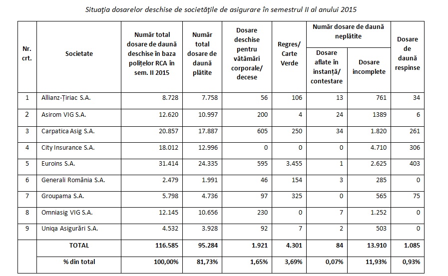 In perioada iulie – decembrie 2015, societatile de asigurare au deschis un numar de 116.585 dosare de dauna pentru polite de asigurare obligatorie auto RCA, dintre care: