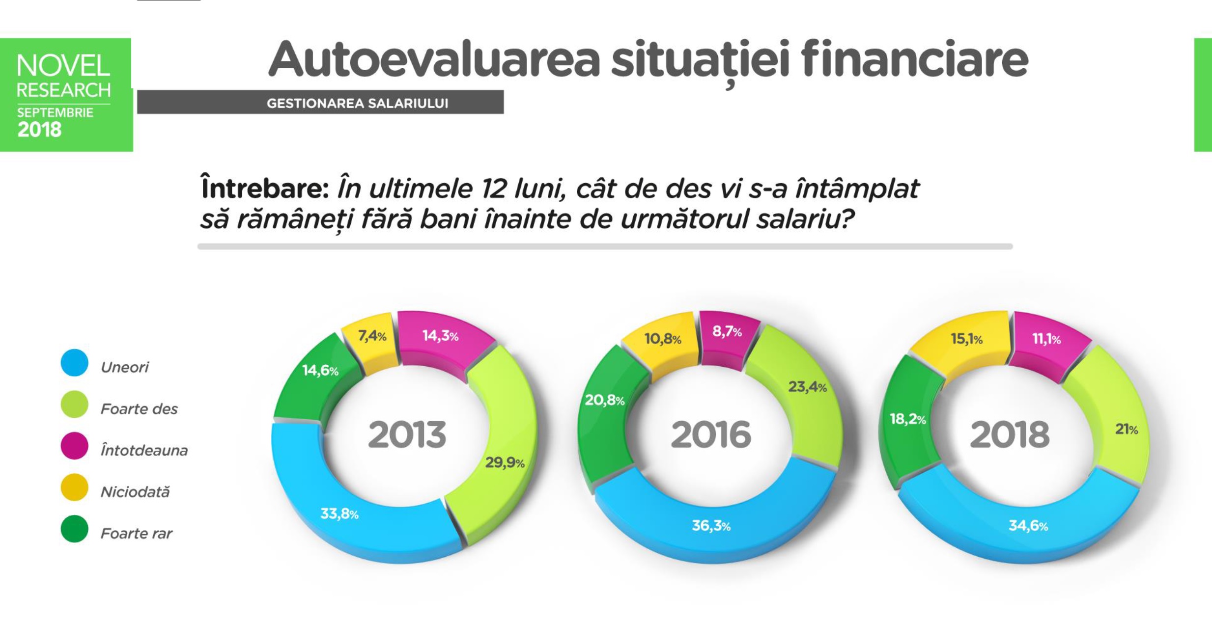 Studiul a mai arătat că procentul celor care rămân întotdeauna fără bani înainte de următorul salariu a scăzut de la 14,3% în 2013 la 8,7% în 2016, avansând apoi din nou, la 11,1% în 2018. La polul opus, ponderea celor care nu rămân niciodată fără bani înainte de leafă a urcat constant, de la 7,4% în 2013 la 10,8% în 2016 și 15,1% în 2018.