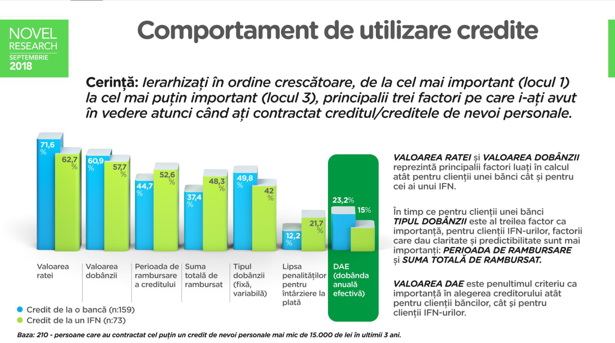 De altfel, românii care au accesat credite în ultimii 3 ani consideră că cele mai importante criterii în alegerea unui creditor sunt valoarea ratei și nivelul dobânzii. În timp ce, pentru clienții băncilor, tipul dobânzii este al treilea factor ca importanță, pentru clienții IFN-urilor, factorii care dau claritate și predictibilitate sunt mai importanți: perioada de rambursare și suma totală de rambursat. Valoarea DAE este penultimul criteriu ca importanţă în alegerea creditorului atât pentru clienţii băncilor, cât şi pentru clienţii IFN-urilor.