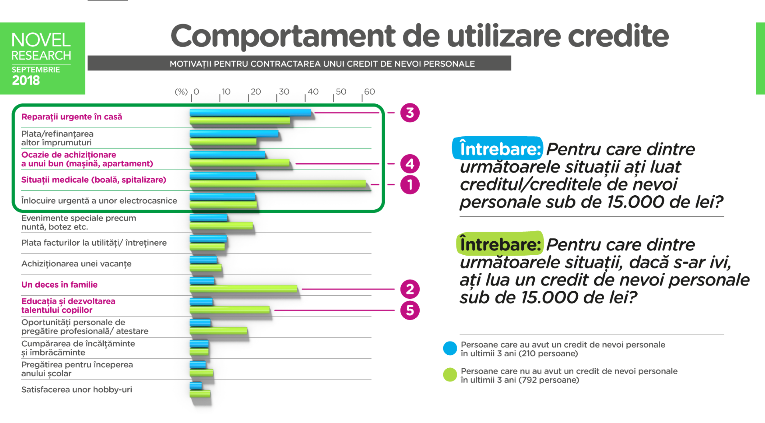Majoritatea românilor care au luat un împrumut sub 15.000 de lei în ultimii trei ani, au folosit banii pentru îmbunătăţiri în locuinţă, refinanţarea altor împrumuturi sau achiziţionarea unei maşini sau a unei locuinţe. De asemenea, creditele au fost contractate pentru îngrijiri medicale sau evenimente în familie (nuntă, botez etc.). Dintre cei care nu s-au împrumutat în ultimii trei ani, dacă ar fi să o facă, majoritatea ar folosi banii pentru îngrijiri medicale, să acopere cheltuielile pentru un eveniment tragic în familie, îmbunătăţiri în locuinţă sau educaţia copiilor. Întrebaţi despre impactul unei măsuri de plafonare a DAE, românii cred că efectele negative s-ar răsfrânge cu precădere asupra celor aflaţi în situaţii sensibile: probleme medicale sau decesul cuiva din familie.