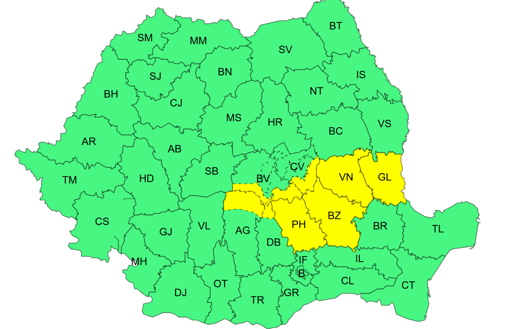 Vizate sunt nordul Munteniei, sudul Moldovei și sud-estul Transilvaniei. Aici, vor fi averse însemnate cantitativ, pe alocuri însoțite de descărcări electrice. În intervale scurte de timp sau prin acumulare cantitățile de apă vor fi de 25…30 l/mp și izolat peste 40 l/mp.