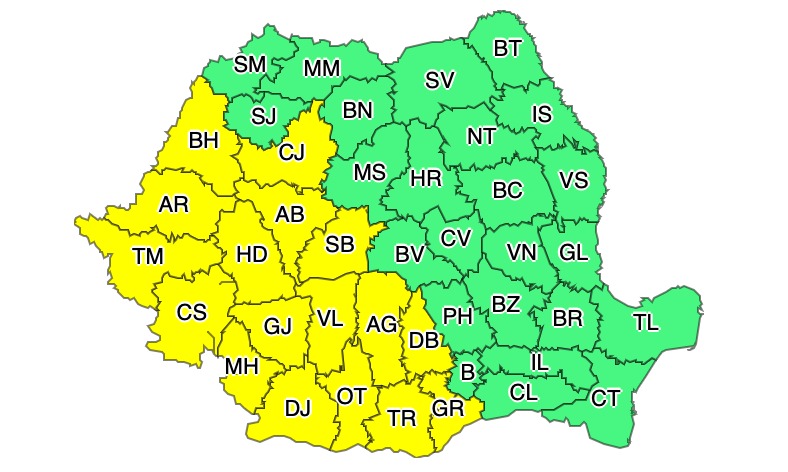 A doua averizare cod galben va fi în vigoare miercuri, între orele 06.00 – 21.00.