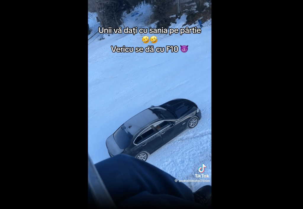„Unii vă daţi cu sania pe pârtie, vericu se dă cu F10”, scrie utilizatorul care a postat imaginile pe TikTok, în cursul zilei de vineri.