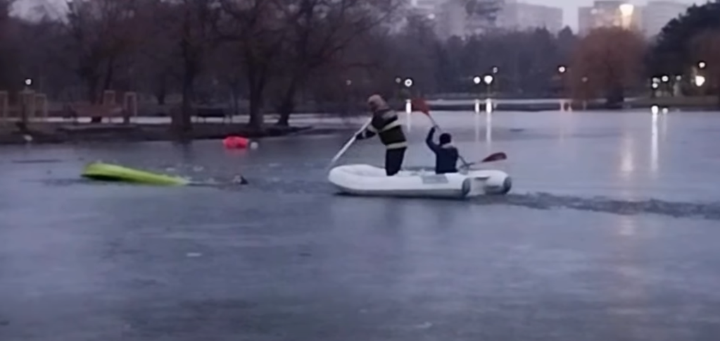 Pompierii din București au salvat un tânăr care a căzut într-un lac înghețat în timp ce încerca să scoată din apă un câine – VIDEO