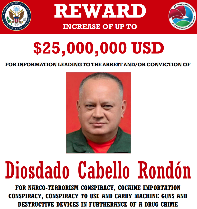 SUA a mărit în ianuarie anul trecut de la 10 la 25 de milioane de dolari recompensa pentru prinderea lui Cabello.