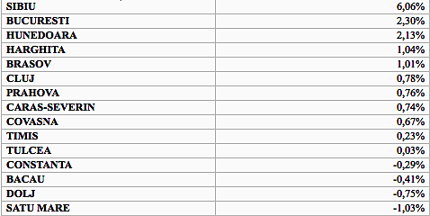 Bucurestiul are crestere de 2,30 (al doilea la nivel national dupa Sibiu), cele mai mari cresteri avand loc la sectoarele 4 (plus 3,42%), 1 (2,93), 2 (2,78) si 6 (2,43).