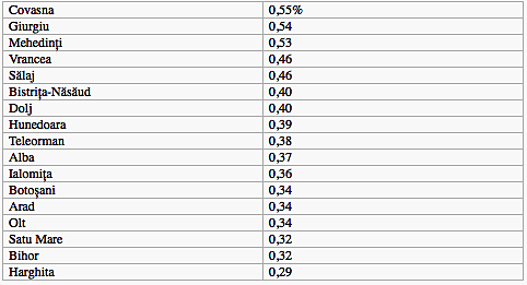 Fata de raportarea de la ora 13, Covasna a urcat spectaculos de pe locul 13 direct pe primul loc. Giurgiu a ramas pe locul al doilea, Salaj si Hunedoara au coborat, iar Mehedinti si Vrancea au urcat pe locurile 3 si 4.