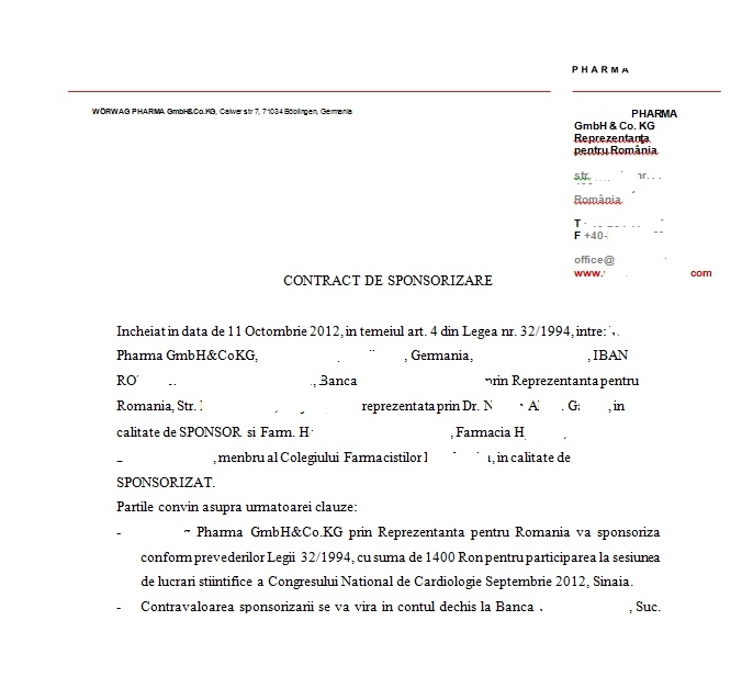 Mai jos, un contract de sponsorizare al unui farmacist. Al medicului meu e la fel. Ma intreb cum sta cu moralul un medic (ori un farmacist) care stie foarte bine ca recomanda anumite medicamente doar pentru a merge cu sotia intr-o excursie pe banii mei, pana la urma….Nu e si asta o forma de spaga?