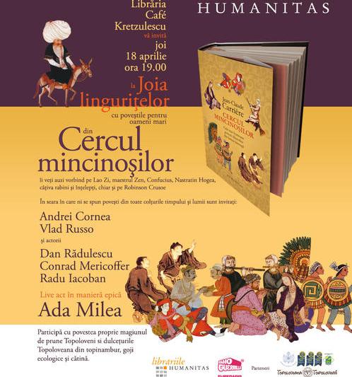 Cele mai frumoase poveşti ale omenirii sunt anonime, iar cei mai iscusiţi povestitori sunt cei care inventează lumi şi reinventează lumea. Această minunată stirpe a „mincinoşilor”, născută în zorii civilizaţiei din nevoia oamenilor de a desluşi tainele vieţii şi ale morţii, ne încântă şi astăzi cu istorii pline de farmec. Librăria Café Kretzulescu vă invită joi, 18 aprilie, ora 19.00 la Joia linguriţelor cu poveşti pentru oameni mari din Cercul mincinoşilor de Jean-Claude Carrière.