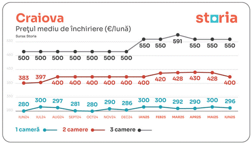 În luna iunie 2025, prețurile chiriilor s-au menținut la un nivel similar cu cel din luna anterioară, însă au înregistrat o creștere medie de 5% față de aceeași perioadă a anului trecut. Cele mai ridicate valori ale chiriilor continuă să fie în Sectorul 1 (790 euro) și Sectorul 2 (650 euro) din București, precum și în Cluj-Napoca (600 euro), potrivit datelor Storia, platforma de imobiliare lansată de OLX.