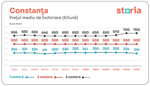 CONSTANȚA înregistrează o ușoară scădere de 2% a prețului mediu pentru garsoniere, care a ajuns la 319 euro. Apartamentele cu două camere s-au menținut la 500 de euro, iar cele cu trei camere au înregistrat o creștere de 7% față de anul trecut, ajungând la 700 de euro.