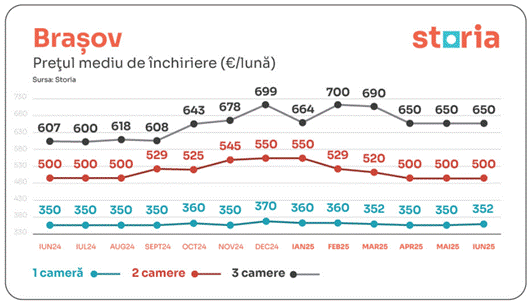 BRAȘOV: prețurile medii de cerere au rămas stabile pentru garsoniere (352 euro) și apartamente cu două camere (500 euro). Pentru apartamentele cu trei camere, prețul mediu a crescut ușor, cu 7%, ajungând la 650 de euro.