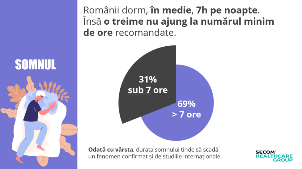 Durata medie de somn raportată este de aproximativ 7 ore pe noapte, aflată la limita inferioară a recomandării de 7–8 ore a Institutului Național pentru Sănătate a SUA (NIH), însă 31% dintre români dorm sub 6,5 ore, o durată insuficientă pentru refacerea fizică și mentală. Această situație este întâlnită mai frecvent în rândul Generației X (43–55 ani) și Boomers (56-65 ani).