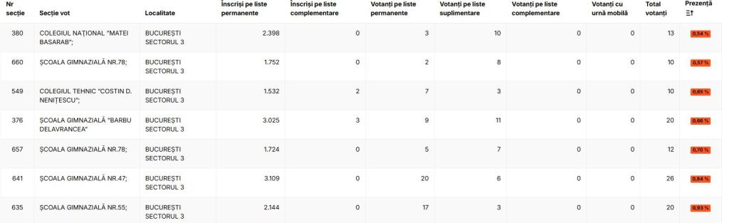 Toate secțiile de votare unde prezența este de sub 1% se află în Sectorul 3 al Capitalei, potrivit datelor afișate pe site-ul Autoritățiile Electorale Permanente, consultate de HotNews la ora 19.00.