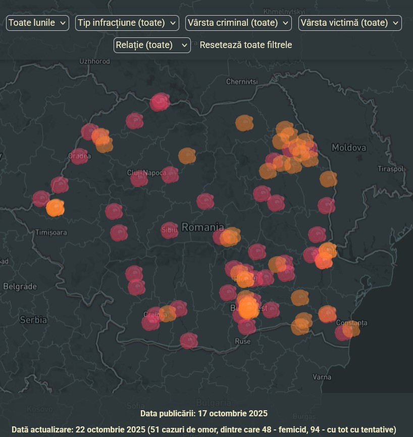 Site-ul de investigații Snoop a realizat recent o hartă a femicidelor în România. În medie, la fiecare trei zile ale lui 2025, un bărbat a încercat să omoare o femeie în România.
