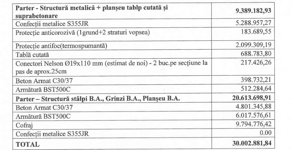 Cea mai mare sumă, de 20 de milioane de lei, va merge pentru achiziția de „structură stâlpi B.A., Grinzi B.A., Planșeu B.A.”.