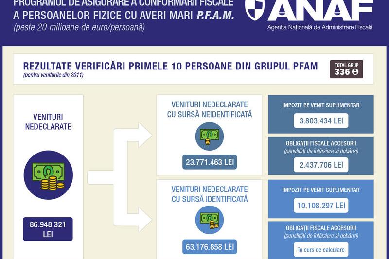 In anul 2015 au fost finalizate verificarile fiscale in cazul primelor 10 persoane din grupul Persoanelor Fizice cu Averi Mari (PFAM) care este format din 336 persoane, asupra carora se fac analize si verificari privind riscurile fiscale si se aplica programe de conformare, au transmis luni oficialii Fiscului. Verificarile fiscale prealabile au fost declansate efectiv in anul 2013, iar in 2014 au fost declansate verificari fiscale la perso Ve ituanele fizice pentru care s-a constatat indeplinirea conditiilor legale privind diferenta semnificativa intre veniturile estimate pe baza situatiei fiscale personale si cele declarate organelor fiscale. Rezultatele verificarilor primelor 10 persoane din grupul PFAM (pentru veniturile din anul 2011) arata venituri nedeclarate dce peste 86,94 milioane de lei.