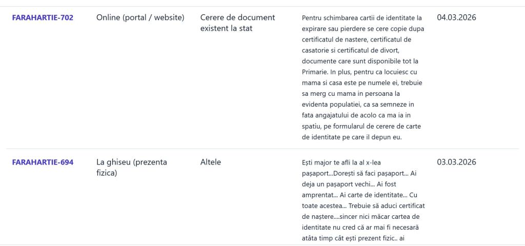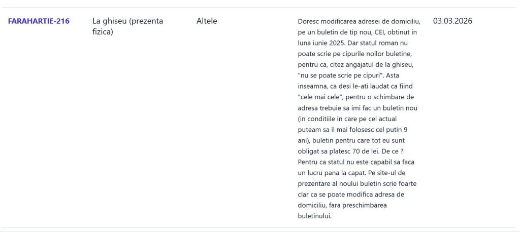 „Doresc modificarea adresei de domiciliu, pe un buletin de tip nou, CEI, obținut în luna iunie 2025. Dar statul român nu poate scrie pe cipurile noilor buletine, pentru că, citez angajatul de la ghișeu, „nu se poate scrie pe cipuri”. Asta înseamnă, că deși le-ați lăudat ca fiind „cele mai cele”, pentru o schimbare de adresă trebuie să îmi fac un buletin nou (în condițiile în care pe cel actual puteam să îl mai folosesc cel puțin 9 ani), buletin pentru care tot eu sunt obligat sa plătesc 70 de lei. De ce? Pentru că statul nu este capabil să facă un lucru până la capăt. Pe site-ul de prezentare al noului buletin scrie foarte clar că se poate modifica adresa de domiciliu, fără preschimbarea buletinului”, reclamă un cetățean.