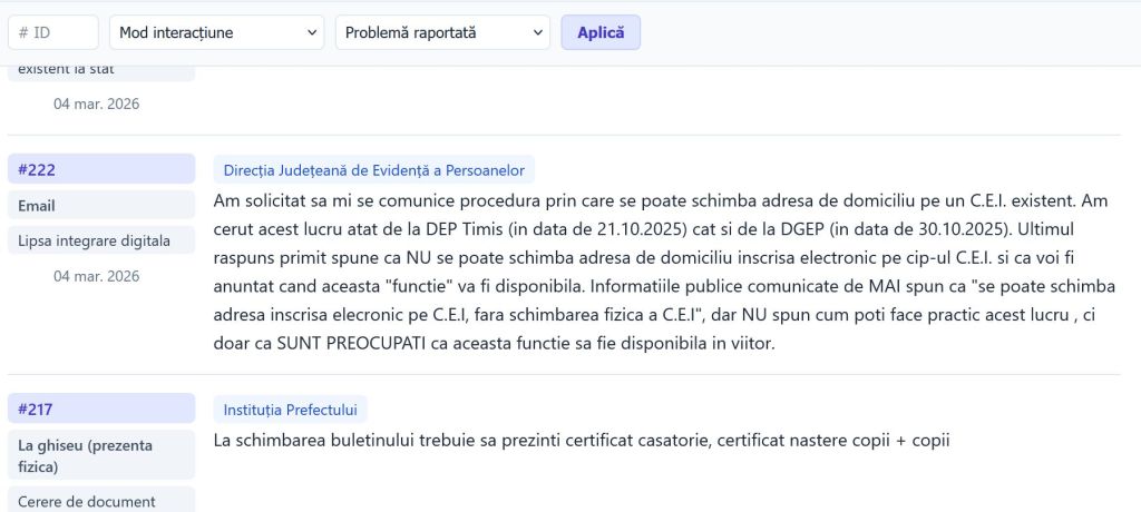 „Am solicitat să mi se comunice procedura prin care se poate schimba adresa de domiciliu pe un C.E.I. existent. Am cerut acest lucru atât de la DEP Timiș (in data de 21.10.2025) cât și de la DGEP (in data de 30.10.2025). Ultimul răspuns primit spune ca NU se poate schimba adresa de domiciliu înscrisă electronic pe cip-ul C.E.I. și că voi fi anunțat când aceasta „funcție” va fi disponibilă. Informațiile publice comunicate de MAI spun că „se poate schimba adresa înscrisă electronic pe C.E.I, fără schimbarea fizica a C.E.I”, dar NU spun cum poți face practic acest lucru, ci doar ca SUNT PREOCUPAȚI ca această funcție să fie disponibilă în viitor”, semnalează alt utilizator.