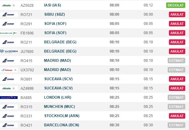Dimineață, puțin după ora 08.00, pe site-ul Companiei Naționale Aeroporturi București, Tarom apărea cu opt curse anulate. Alte trei zboruri din cursul zilei de vineri, de la companii diferite, erau anunțate și ele ca fiind anulate.