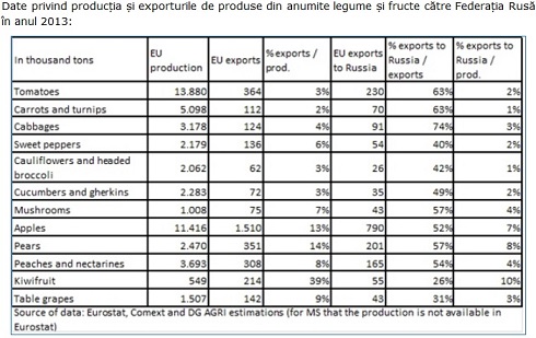 Rusia este principala piata de export pentru mai multe tipuri de fructe si legume, iar interdictia de import a fost anuntata de Moscova in plin sezon de recoltare, reclama Comisia Europeana.