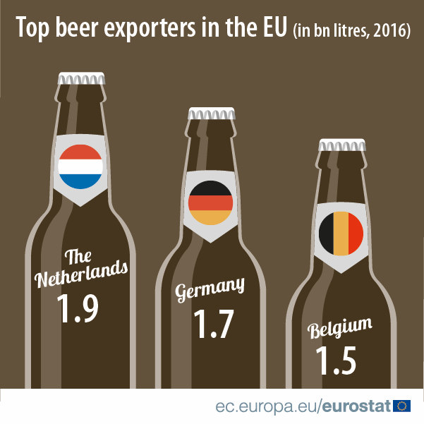 Olanda a exportat 1,9 miliarde de litri de bere in 2016, facand-o cel mai mare exportator de bere din toate statele membre UE, inaintea Germaniei (1,7 miliarde de litri), Belgiei (1,5 miliarde de litri), Frantei (0,7 miliarde de litri) sau a Regatului Unit (0,6 miliarde de litri).
