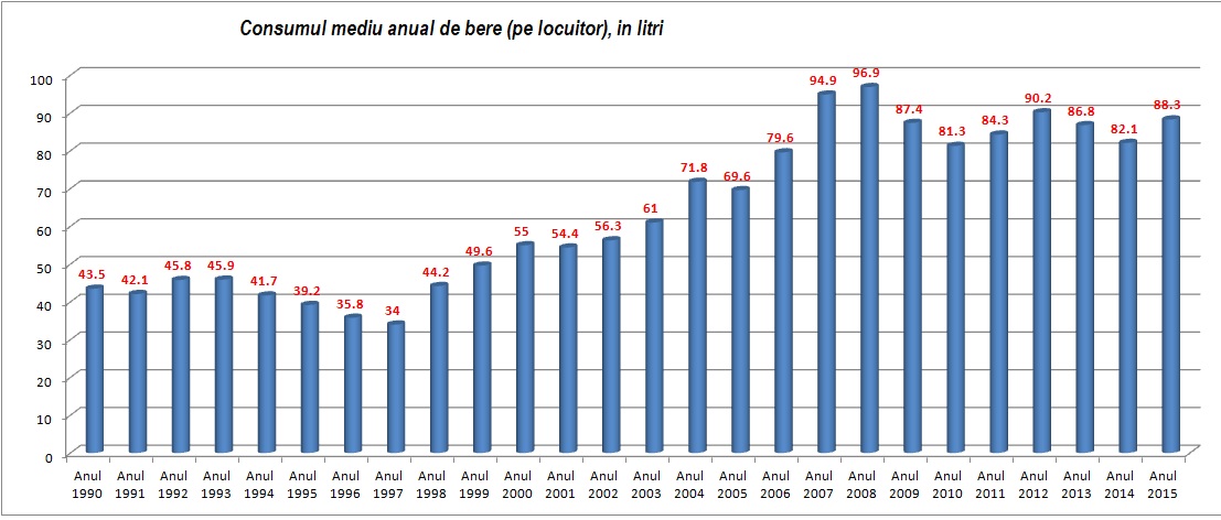 In Romania, consumul mediu de bauturi, pe locuitor, a crescut cu 6,2 litri. Resursele totale de bere (productia interna plus importurile) au fost mai mari cu 1380,9 mii hl in 2015 fata de anul precedent, fiind asigurate in proportie de 96,5% din productia interna. Fata de anul precedent, importul de bere a scazut cu 23,2%.