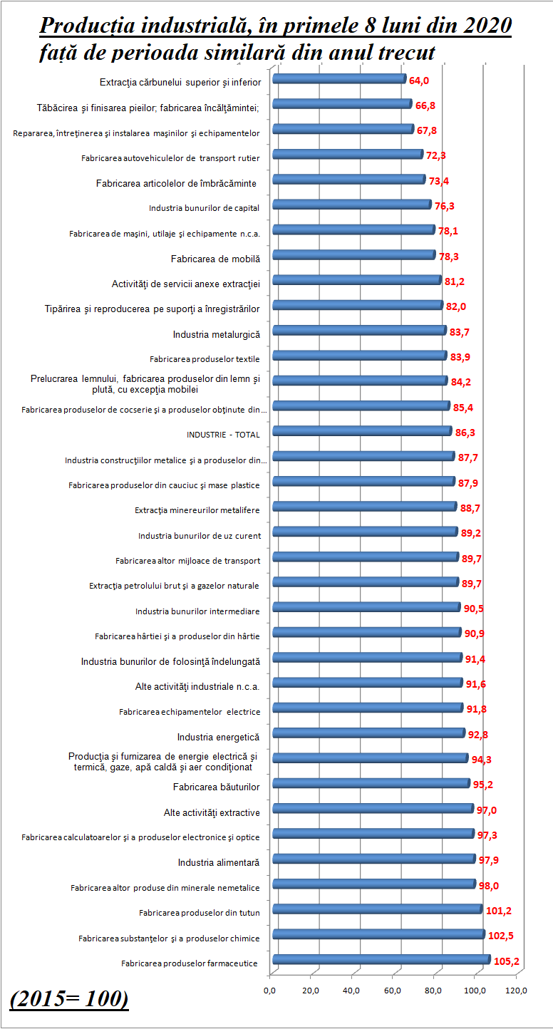 În perioada 1.I – 31.VIII.2020, comparativ cu perioada 1.I – 31.VIII.2019, producţia industrială (serie brută) a fost mai mică cu 13,7%, din cauza scăderilor din industria prelucrătoare (-15,2%), industria extractivă (-10,9%) și producţia şi furnizarea de energie electrică şi termică, gaze, apă caldă şi aer condiţionat (-5,7%).