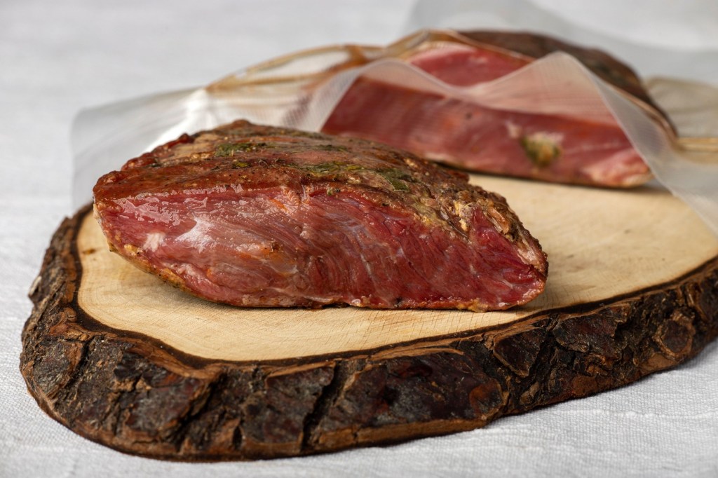 În metoda tradițională românească, carnea este mai întâi dezosată și scursă de sânge. Apoi, după realizarea unor incizii în părțile mai groase, este condimentată prin frecarea cu un amestec de cimbru, boia, piper, rozmarin, busuioc și ienibahar, urmând rețeta cunoscutului bucătar local Radu Anton Roman. În final, carnea este acoperită cu un strat subțire de sare. După maturare, este gata pentru gătit, deși uneori este și afumată.
