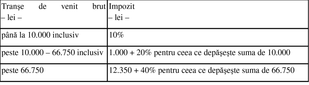 4. În cazul veniturilor obținute din jocuri de noroc se propune menținerea modalității de determinare a impozitului pe venit prin aplicarea unui barem de impunere cu tranșe de venit asupra fiecarui venit brut cu cote de impunere cuprinse între 10% și 40 %. Astfel, baremul de impunere asupra fiecărui venit brut primit de un participant de la un organizator sau plătitor de venituri din jocuri de noroc, se modifică: