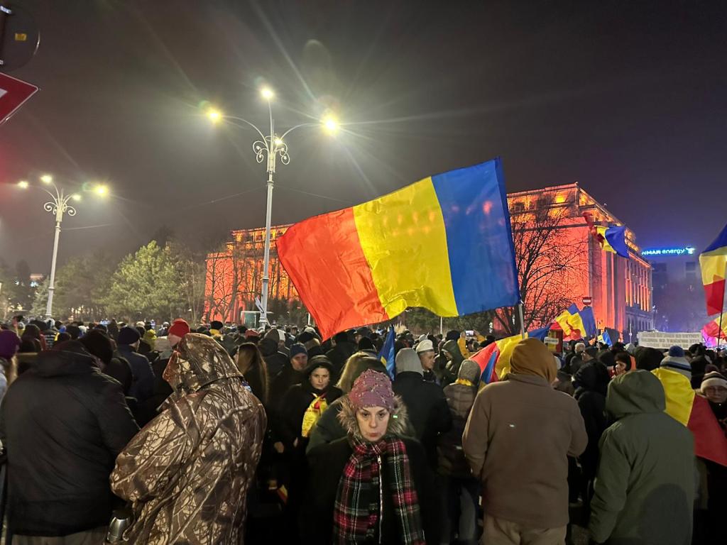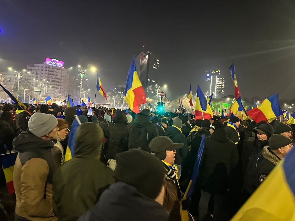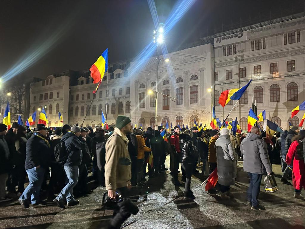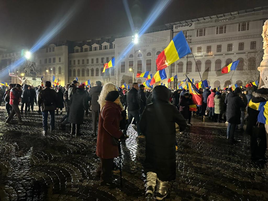Protestul din Piața Universității a început. La manifestație s-au adunat câteva mii de persoane, cu steaguri și vuvuzuele, inclusiv cu drapelul Statelor Unite.