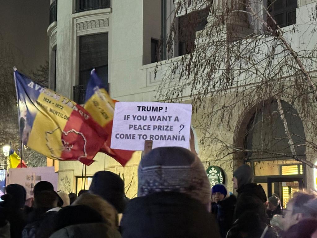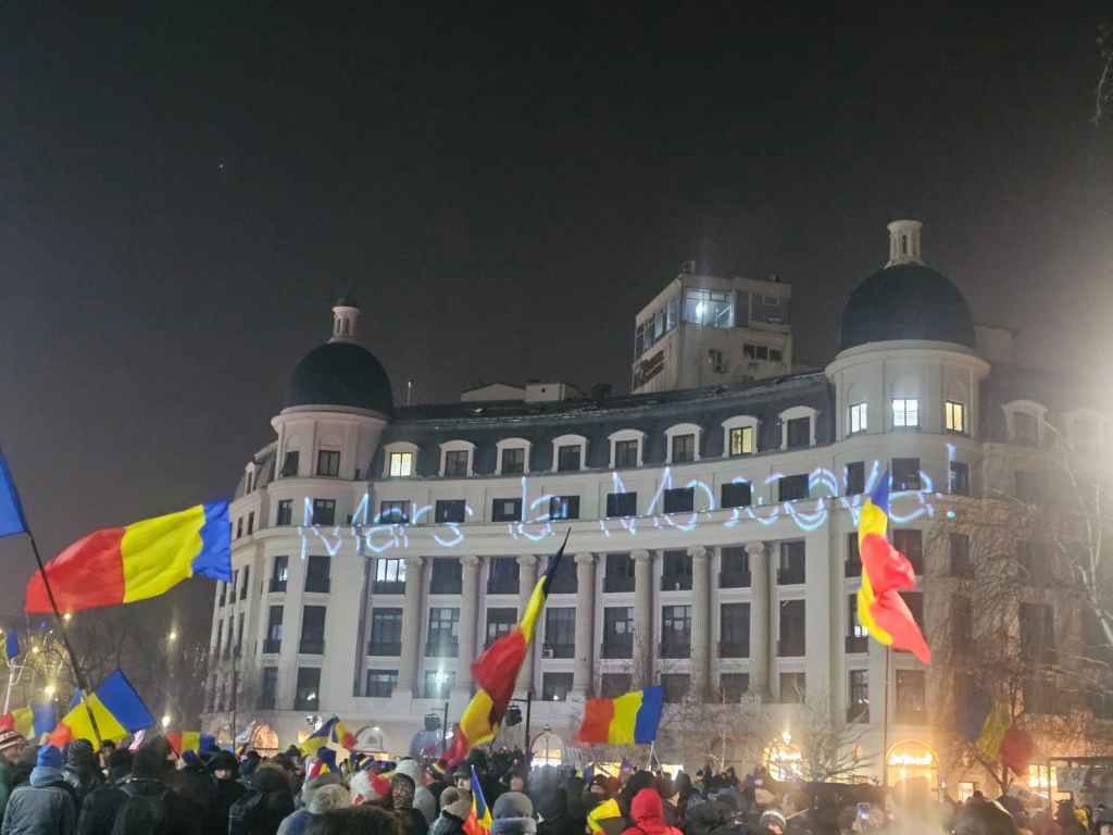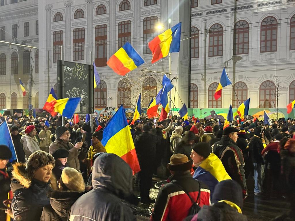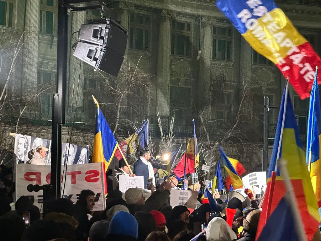Protestul din Piața Universității a început. La manifestație s-au adunat câteva mii de persoane, cu steaguri și vuvuzuele, inclusiv cu drapelul Statelor Unite.