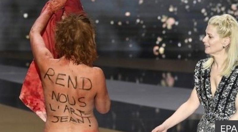 Corinne Masiero, 57 de ani, și-a făcut apariția pe scenă într-un costum de măgar, purtat peste o rochie cu pete roșii imitând sângele. Actrița și-a dat jos hainele pentru a afișa mesajele scrise pe piele, făcând astfel senzație la gala Oscarului francez, relatează BBC News.