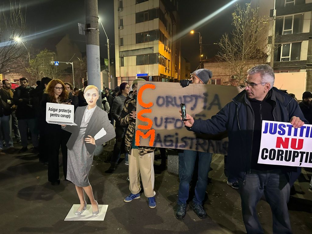 În jur de 400 de persoane manifestează în fața sediului CSM. Jandarmeria a extins spațiul de protest, astfel că oamenii se află acum și pe carosabil. Circulația este închisă pe sensul Știrbei Vodă.