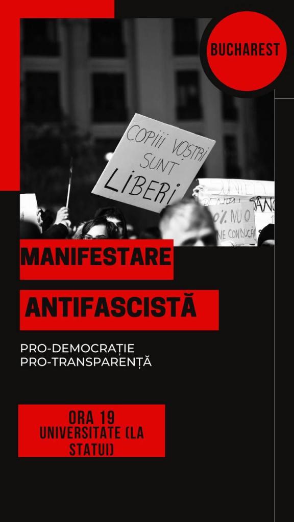 Protestatarii au anunțat că se vor strânge vineri seară de la ora 19:00, în zona statuilor de la Universitate, pentru o „manifestație antifascistă”, potrivit afișului.
