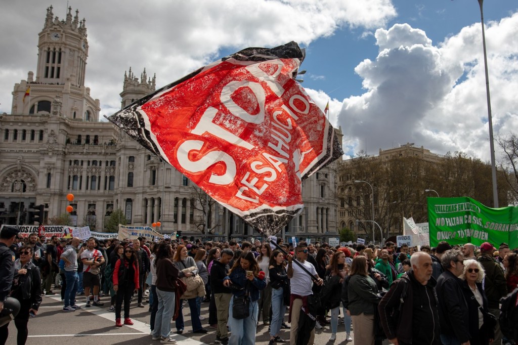 „Nu contează cine guvernează, trebuie să apărăm dreptul la locuință”, au scandat participanții la marșul din Madrid, unde peste 150.000 de oameni au mărșăluit prin centrul capitalei, potrivit asociației locale a chiriașilor.