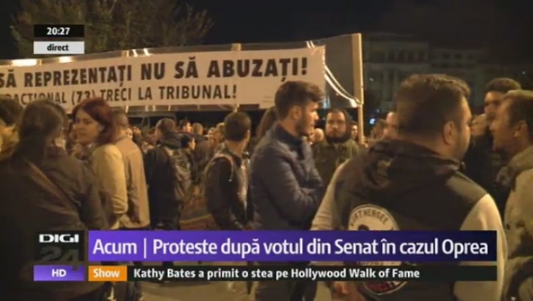 Protestul impotriva lui Gabriel Oprea care are loc joi seara la Palatul Parlamentului din Bucuresti, si la care participa circa 4.000 de oameni, era subiectul principal al televiziunilor de stiri, cu exceptia Romania TV si B1 TV.