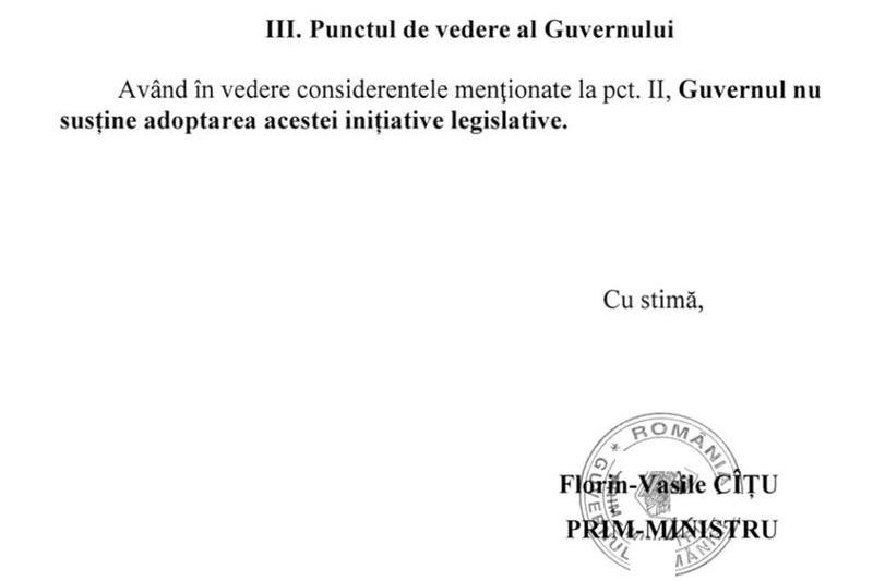 Între timp, Guvernul a transmis un punct de vedere în care scrie negru pe alb, cu litere îngroșate (bold), că: Guvernul nu susține adoptarea acestei inițiative legislative.
