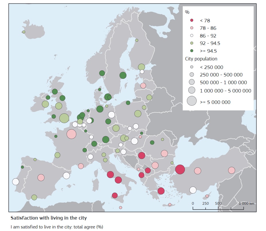 Raportul a fost întocmit pe baza rezultatelor a 58.100 interviuri realizate în 83 de oraşe europene și arată că, în 2019, 9 din 10 persoane s-au declarat satisfăcute de viaţa în oraşul lor.