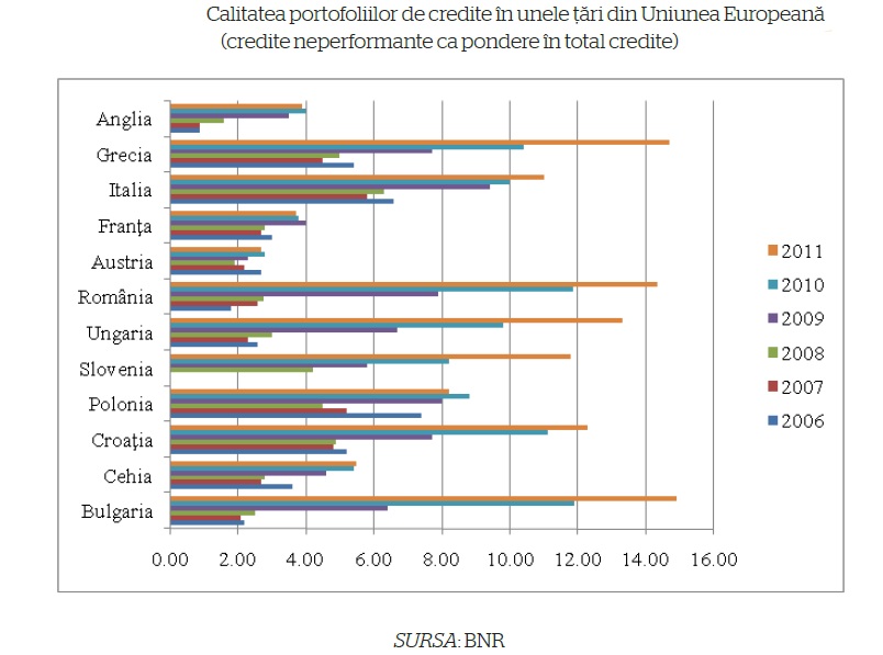 Analizand comparativ calitatea portofoliilor de credite ale bancilor romanesti cu cele ale bancilor din alte state membre UE, se observa o degradare abrupta in perioada 2009-2011 fata de perioada 2006-2008, cand sectorul bancar romanesc era competitiv din acest punct de vedere, in raport cu alte state din regiune si chiar din vestul Europei.