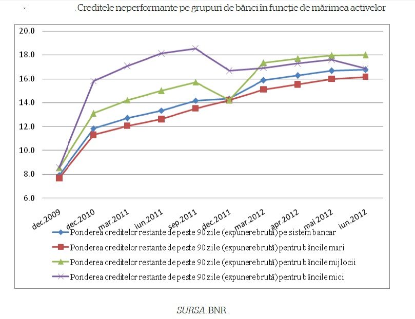 Chiar daca tendinta de crestere a ponderii creditelor neperformante a afectat sistemul bancar in ansamblu, ponderea creditelor restante de peste 90 zile pentru bancile de talie mare se mentine sub valoarea aceluiasi indicator pentru bancile de talie mijlocie si mica.