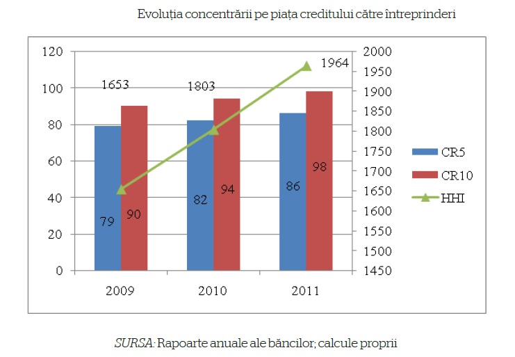 Pe piata creditului comercial se inregistreaza o crestere rapida a gradului de concentrare, valoarea HHI fiind apropiata de nivelul de 2000, consecinta a crizei financiare care a facut ca multe banci de talie mica sa isi reduca expunerea si sa restranga activitatea de creditare catre sectorul corporatist.