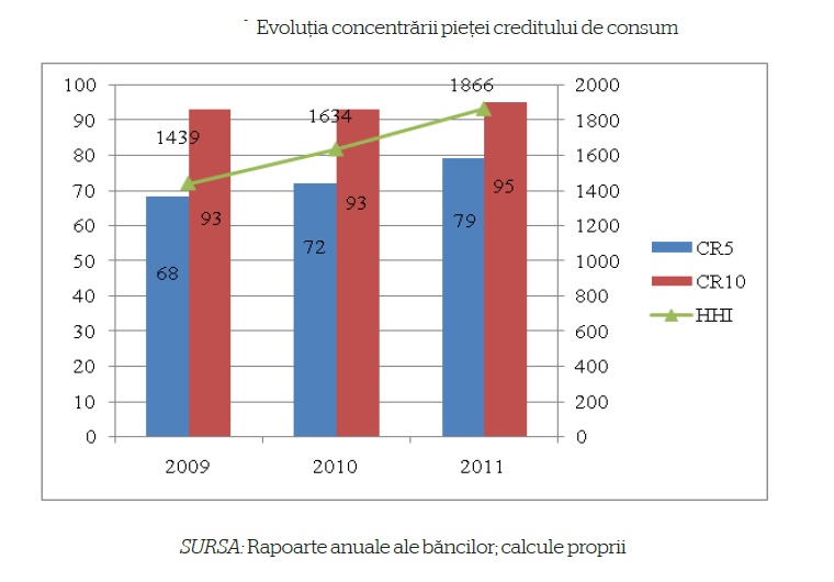Explicatia acestui fenomen este legata de criza economica si financiara care a eliminat o parte dintre competitori. In acelasi timp, evolutia cotelor de piata in sectorul bancar reprezinta un factor avut in vedere de autoritatea de concurenta. De asemenea, cu impact semnificativ pe piata creditului de consum, trebuie avute in vedere si serviciile prestate de institutiile financiare nebancare (IFN), care, desi afectate puternic de criza, detin inca ponderi importante pe pieta mentionata.