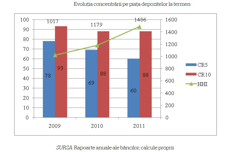 Ponderea detinuta de primele cinci banci in volumul agregat al activelor a fost, la finele anului 2011, de 54,6%, in cel al creditelor de 52,3 %, in cel al depozitelor de 58,0 %, in cel al capitalurilor proprii de 52,8% si in cel al titlurilor de stat de 59,7 %