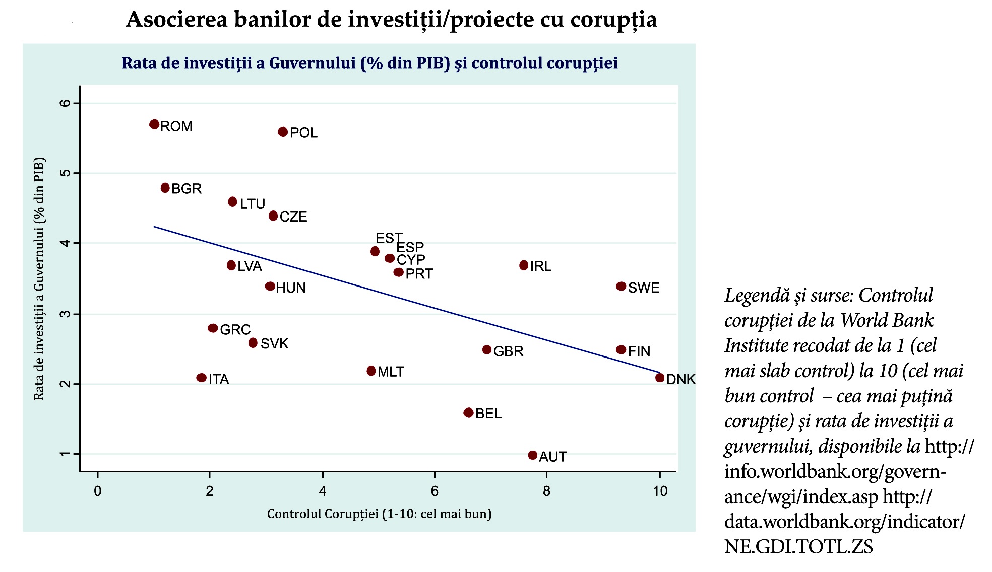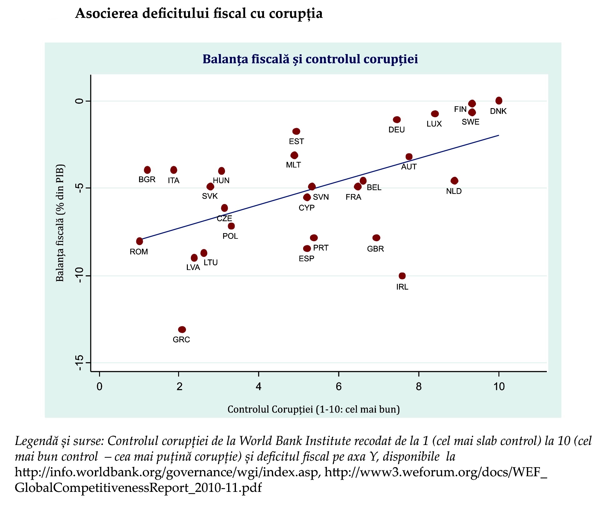 Mai jos, se poate vedea ca tarile care controleaza cel mai putin coruptia precum Romania, Bulgaria, Italia au si deficite mai mari in comparatie cu tari ca Danemarca, Suedia sau Finlanda.