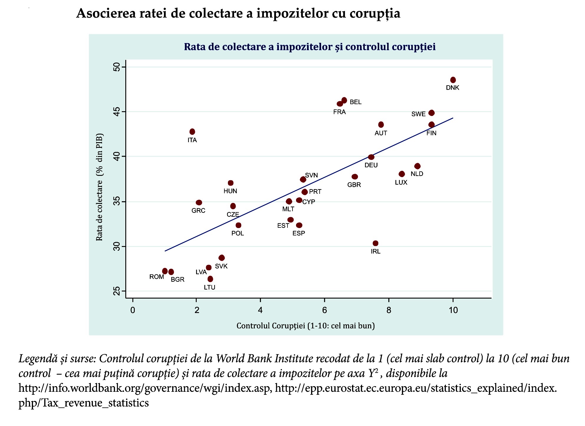 In Figura 2 se poate vedea ca statele care controleaza cel mai putin coruptia, precum Romania, Bulgaria, Letonia, Lituania, Slovacia, au si cele mai mici rate de colectare a impozitelor.