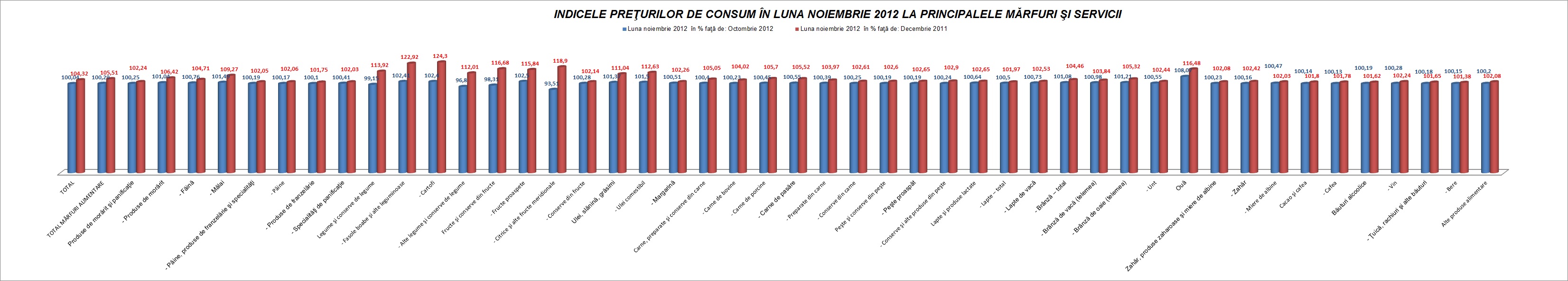 Indicele preturilor de consum (IPC) in luna noiembrie 2012 fata de noiembrie 2011 este 104,56 %, a anuntat marti Institutul National de Statistica. Cresterea medie a preturilor pe total in ultimele 12 luni (decembrie 2011 – noiembrie 2012) fata de precedentele 12 luni (decembrie 2010 – noiembrie 2011) determinata pe baza IPC este de 3,2%, iar cea determinata pe baza indicelui armonizat al preturilor de consum (IAPC) este de 3,3%.In luna noiembrie 2012, fata de luna anterioara, preturile marfurilor alimentare au crescut cu 0,3%, iar cele ale marfurilor nealimentare si tarifele serviciilor au scazut cu 0,1% pentru fiecare.