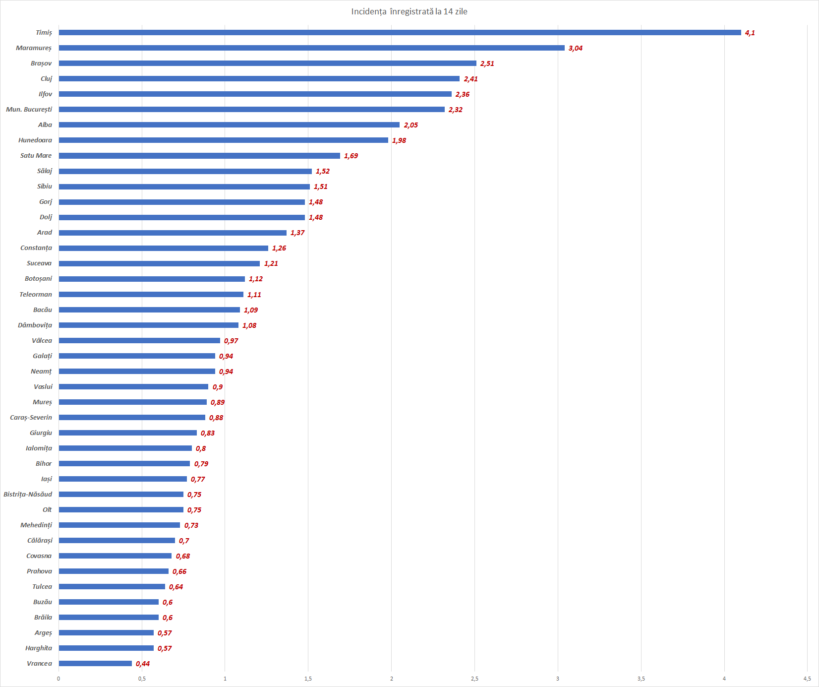 Rata de infectare: Cele mai mari valori au fost în Timiș, Maramureș și Brașov, iar cele mai mici în Vrancea, Harghita și Argeș