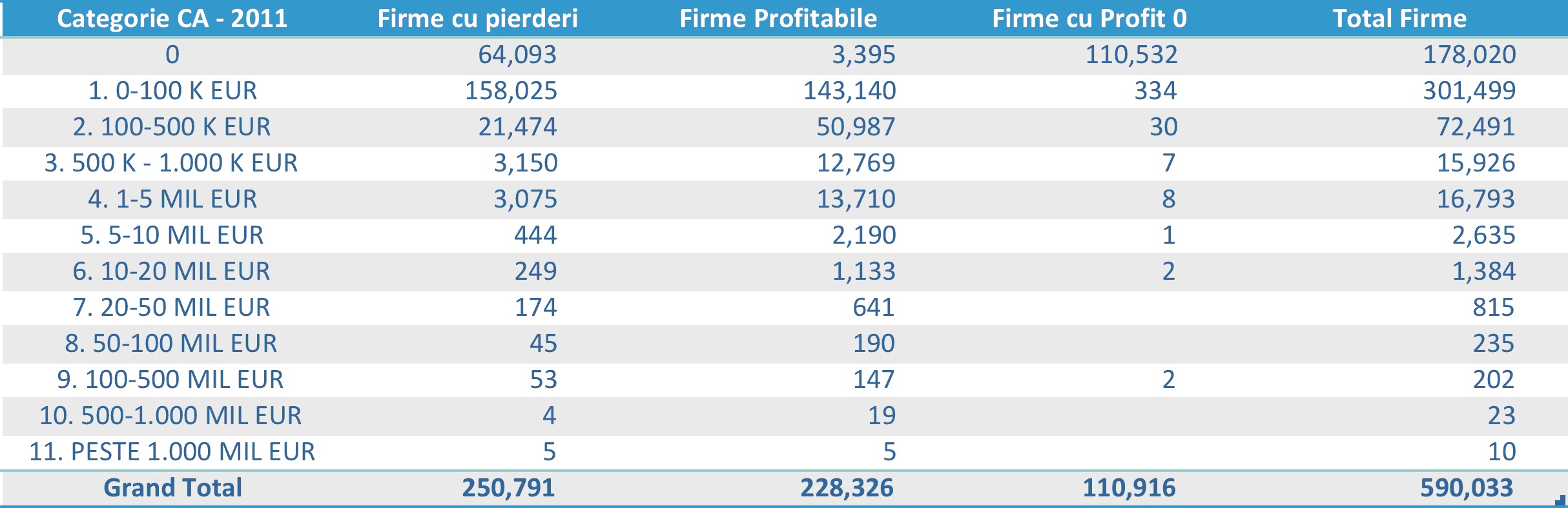 Mai sus aveti numarul companiilor active romanesti care au inregistrat pierderi, profit sau profit 0, distribuite dupa cifra de afaceri din 2011