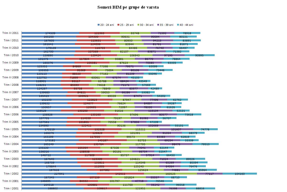 In luna februarie 2012, rata somajului, conform definitiei internationale (BIM), a fost estimata la 7,1%, aflandu-se in scadere cu 0,1 puncte procentuale fata de luna ianuarie. Cei mai multi someri sunt din segmentul de varsta 20-24 de ani, iar numarul total al somerilor din grupa de varsta 20-29 de ani ii depaseste pe toti ceilalti someri din Romania. Datele furnizate de INSSE probeaza o reforma semi-reusita a pietei muncii, iar cercetari recente privind piata muncii din Romania confirma aceasta ipoteza.